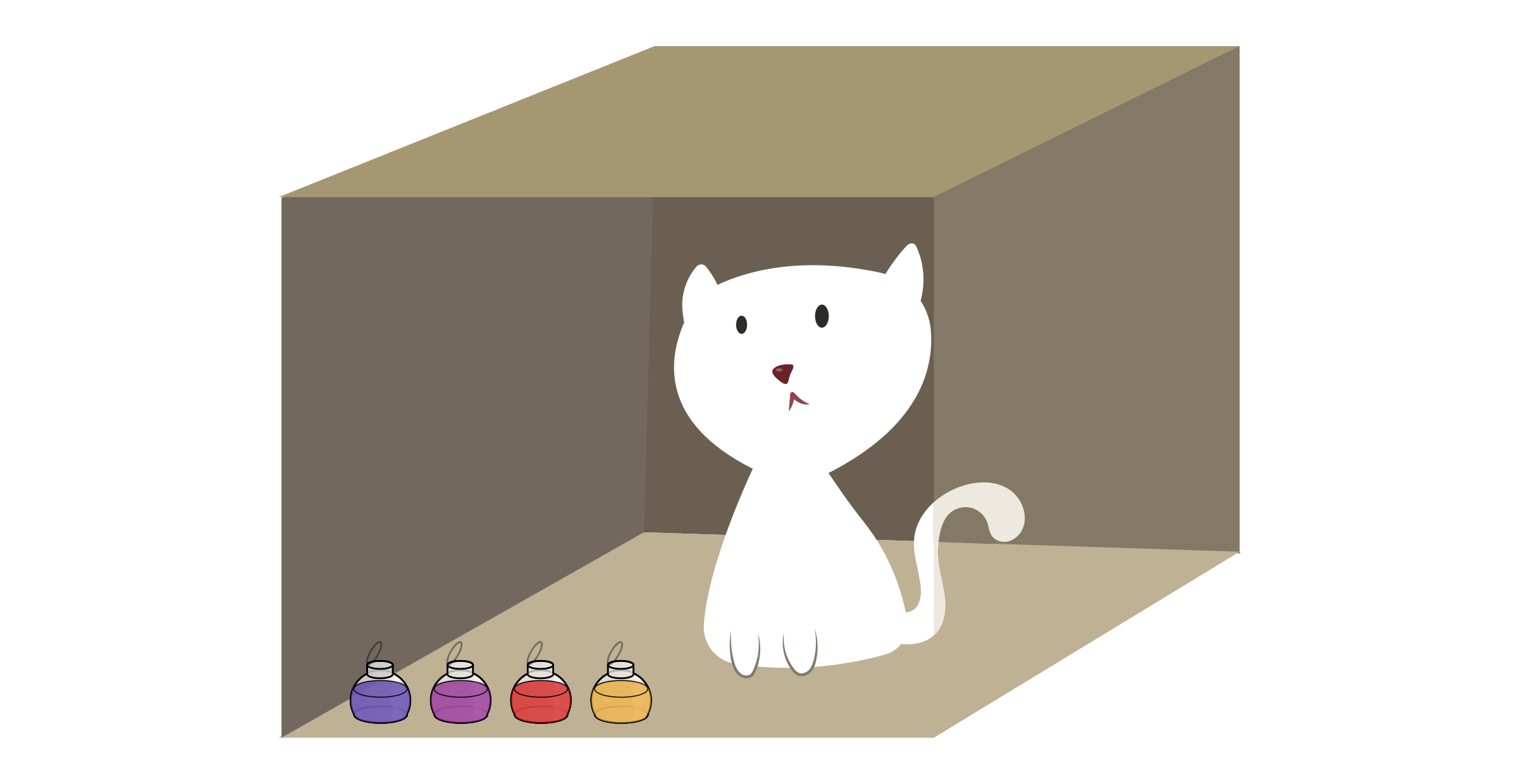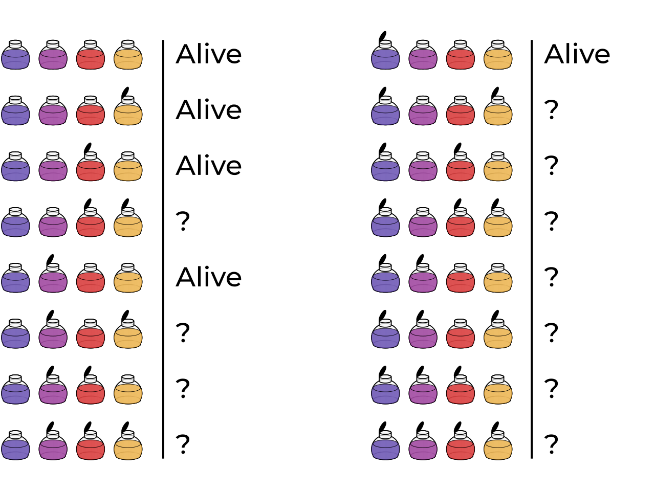 This experiment has four vials of four distinct poisons. No poison is strong enough to kill the cat on its own, but it is possible that some combination of these poisons is lethal. So now let us put all these poisons and the cat in our box and close the lid. Each vial is independently rigged to have a 50% chance of breaking open. Counting carefully, there are 16 possibilities of what could happen inside the box.